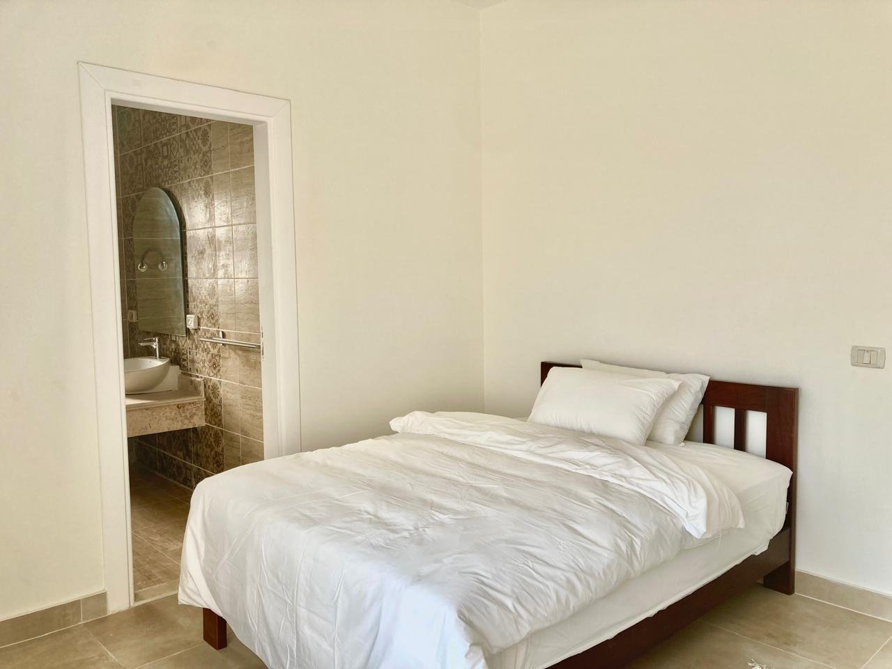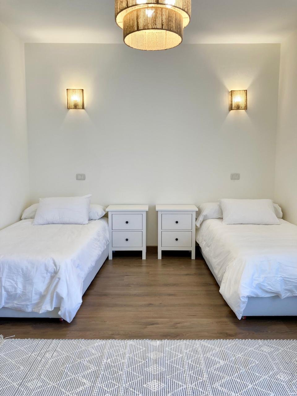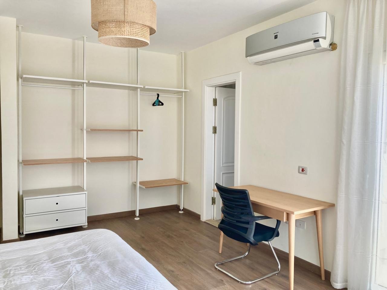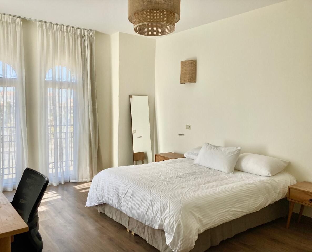 ٤ غرف نوم واسعة، بما في ذلك جناح رئيسي مزود بحمام خاص وشرفة. تم تركيب أجهزة تكييف وستائر — متاح إيجار أو شراء المفروشات والتكيف