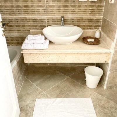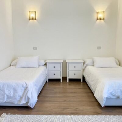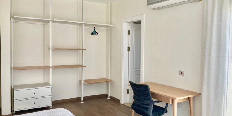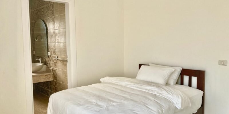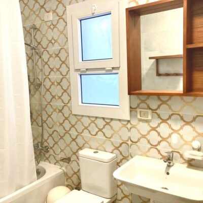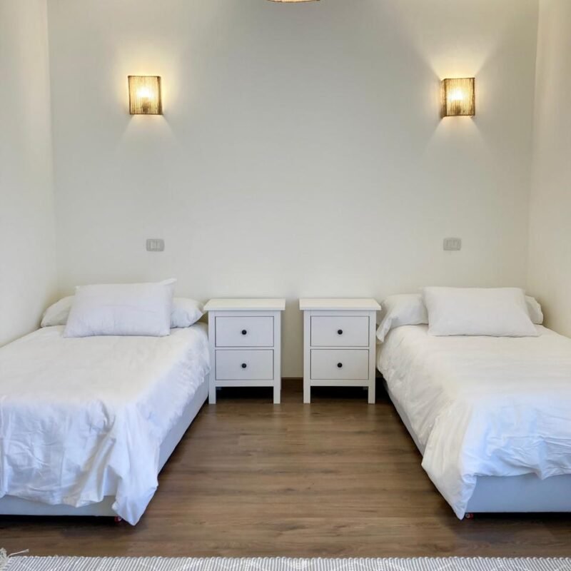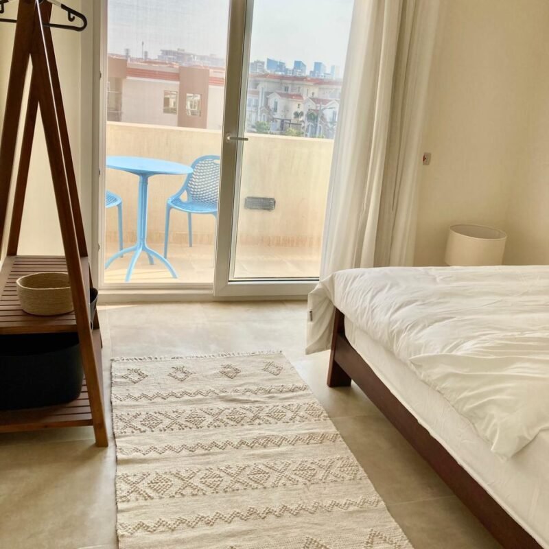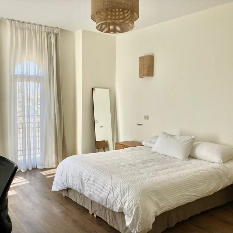 ٤ غرف نوم واسعة، بما في ذلك جناح رئيسي مزود بحمام خاص وشرفة. تم تركيب أجهزة تكييف وستائر — متاح إيجار أو شراء المفروشات والتكيف